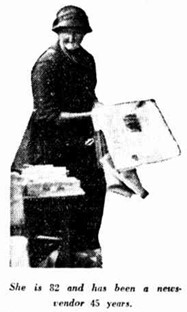 Although newspaper reports continue to cover the activities of Sarah’s sons from this time, and note an incident in 1911 where Sarah witnessed an assault near her newspaper stand at Tooth’s Brewery on Broadway, she does not reappear in the public record until 1932. That year, The Sun featured a story and photograph of Sarah, noting that her age had been exaggerated and describing her as selling newspapers, cigarettes and tobacco “from dawn till dark” at her stand on the corner of George and Park for 45 years. Over the following years, further articles highlighted her long-running newspaper stand. In 1936, she appeared in newspaper and magazine advertisements endorsing Junipah Mineral Spring Salts.